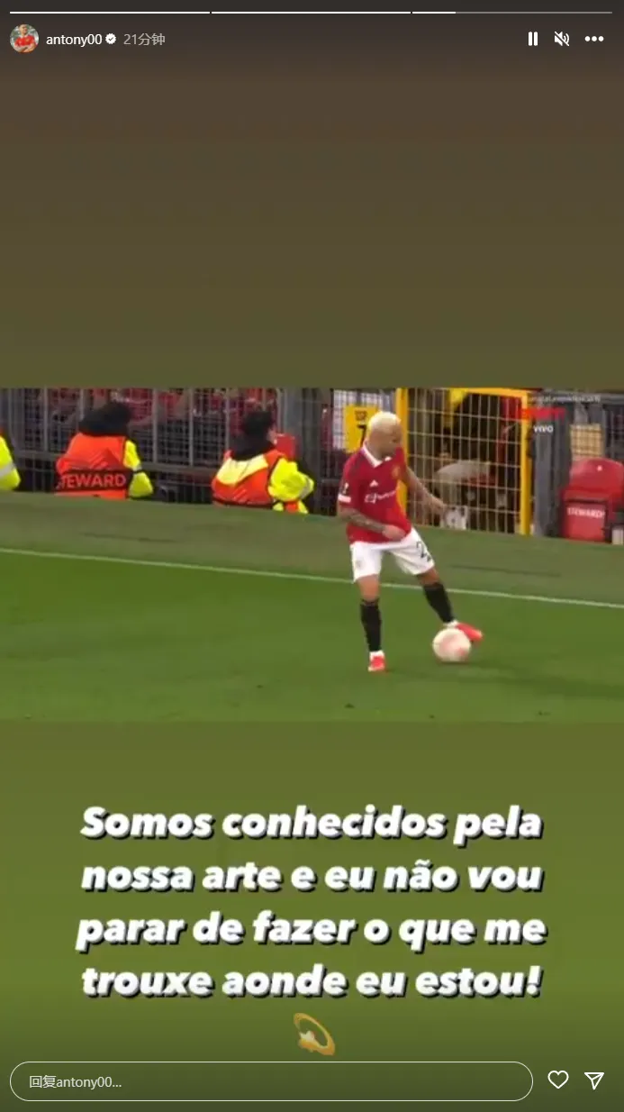 刚刚,安东尼更新了Instagram,上传了自己“圆规表演”的视频片段,并对这个动作进行了回应:“我们以艺术足球而闻名,我不会停止做这样的事情,是这样的事情成就了现在的我。”