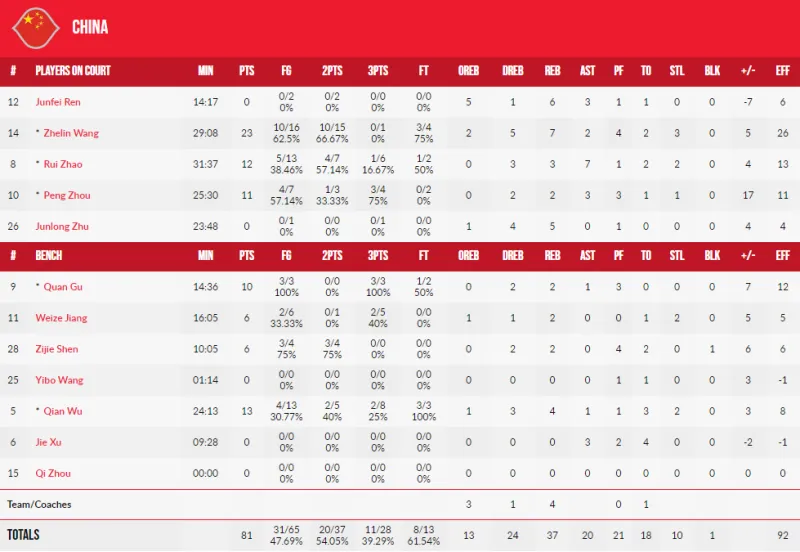 中国队数据:王哲林23分7板;赵睿12分7助攻;吴前13分4板 。