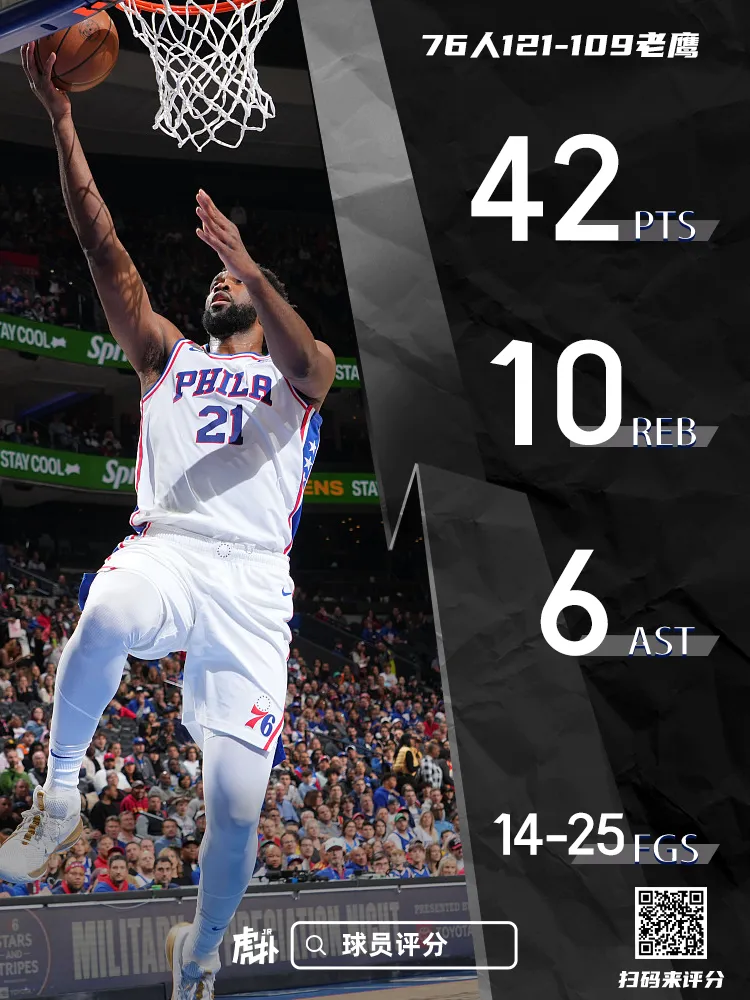 本场比赛,76人球员乔尔-恩比德出战40分钟,25投14中,其中三分球6投1中,罚球16投13中,得到42分10篮板6助攻2抢断2封盖。