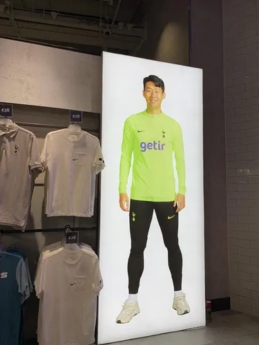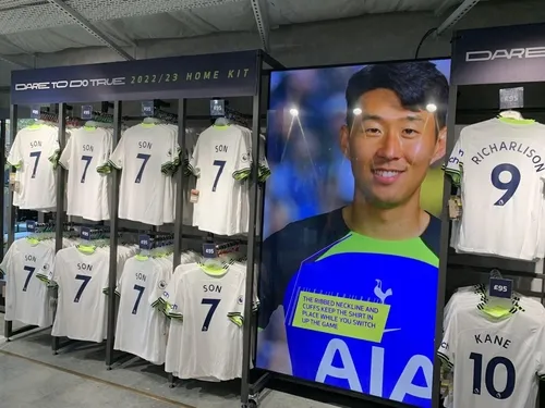 在热刺的球迷周边商店里,立有孙兴慜的巨幅广告牌,橱窗最显眼位置挂着的就是他的7号热刺战袍。