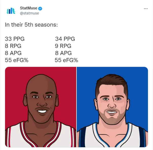 虎扑11月13日讯 美媒StatMuse发推对比了独行侠球员卢卡-东契奇和迈克尔-乔丹的生涯第五个赛季数据对比,具体如下: