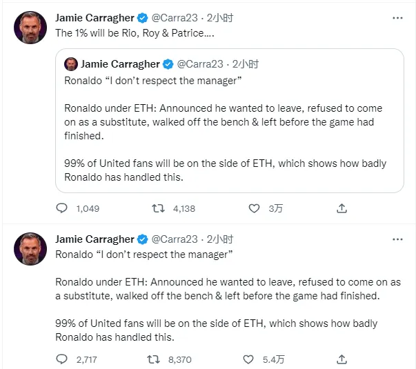 虎扑11月14日讯 利物浦名宿,天空体育评论员杰米-卡拉格(说不好T几)在推特上锐评C罗。