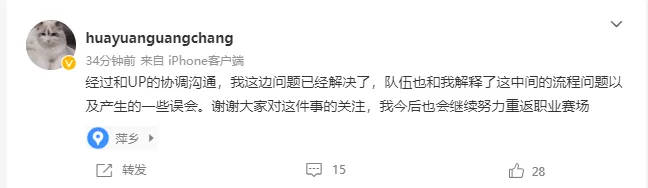 经过和UP的协调沟通,我这边问题已经解决了,队伍也和我解释了这中间的流程问题以及产生的一些误会。谢谢大家对这件事的关注,我今后也会继续努力重返职业赛场