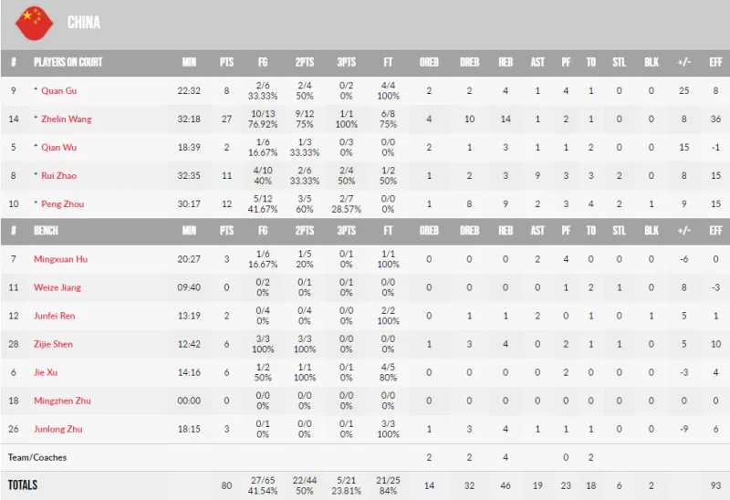 中国队数据:王哲林27分14篮板;周鹏12分9篮板;赵睿11分3篮板9助攻。