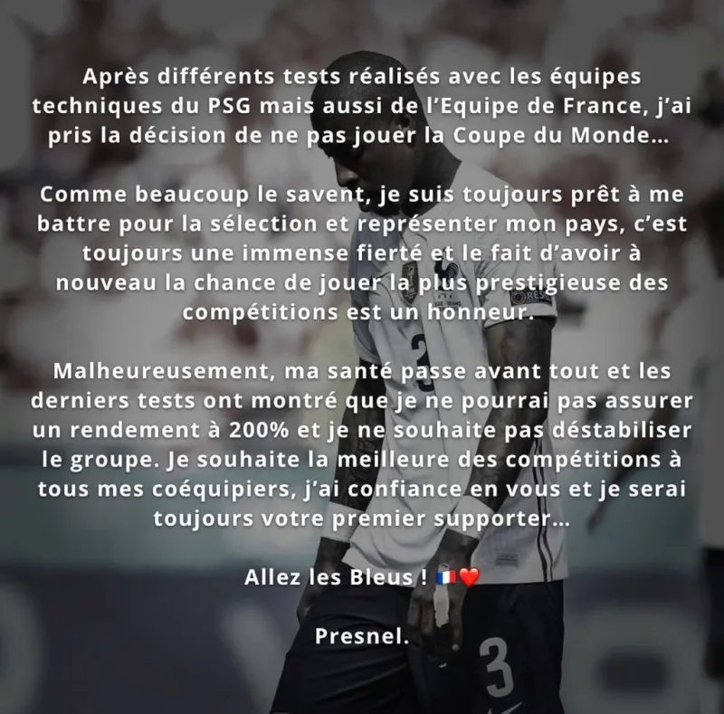 金彭贝写道:“在与巴黎圣日耳曼和法国的技术团队进行了各种测试后,我决定不参加世界杯。众所周知,我随时准备好了为国而战,因为这是一种巨大的自豪感,有机会再次参加最负盛名的比赛也是一种荣幸。不幸的是,健康永远是第一位的,最新的测试也表明了我无法确保200%的表现,我也不希望破坏团队的稳定性。祝我所有的队友比赛顺利,我相信你们,我永远是你们的头号支持者。加油法国队!普雷内尔3。”