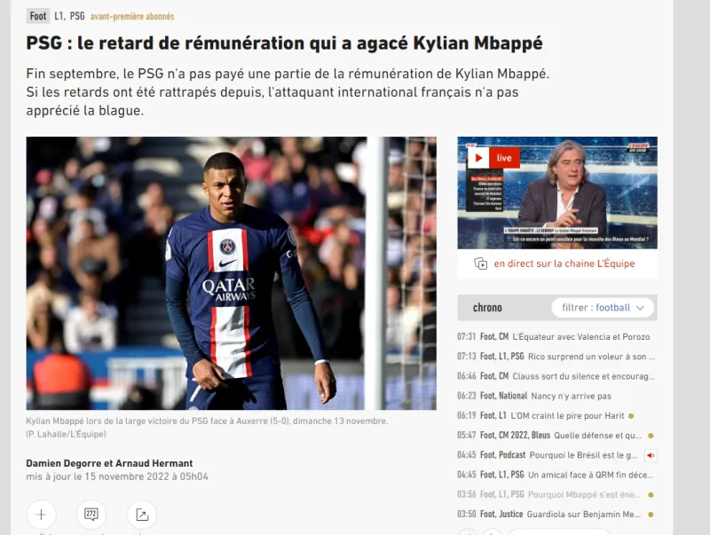 队报同时还提到,巴黎从未延期支付内马尔和梅西的工资。事后,姆巴佩团队决定暂时不对任何情况发表评论。在巴黎圣日耳曼方面,签署合同的副总经理让-克洛德-布兰科没有否认这一消息,他让队报去巴黎圣日耳曼的沟通部门,“询问任何与俱乐部有关的问题”。