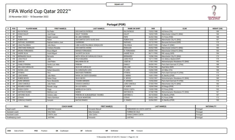 虎扑11月15日讯 国际足联官网公布了各参赛队的号码。葡萄牙队方面,C罗身披7号,安德烈-席尔瓦9号、贝尔纳多-席尔瓦10号。