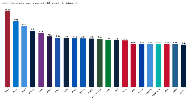 根据StatMuse的数据,东契奇最近的得分爆发使他进入了NBA24周岁历史得分榜的前十。目前,他排名第九,超过了德怀特霍华德的7397分。