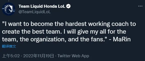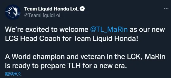 虎扑11月19日讯 北美赛区Liquid战队官宣,S5决赛FMVP,前SKT冠军上单Marin将在新赛季加盟队伍担任主教练一职。Liquid相信Marin已经准备好将队伍带到一个全新的领域。