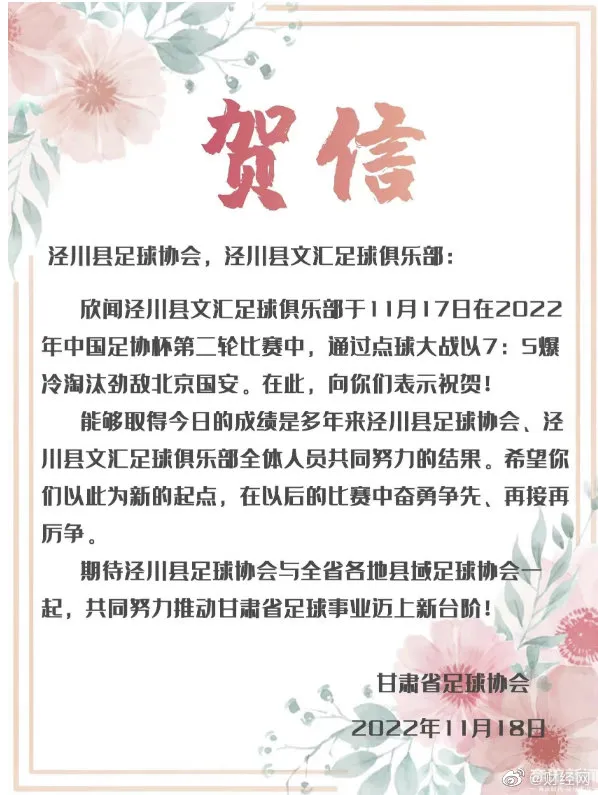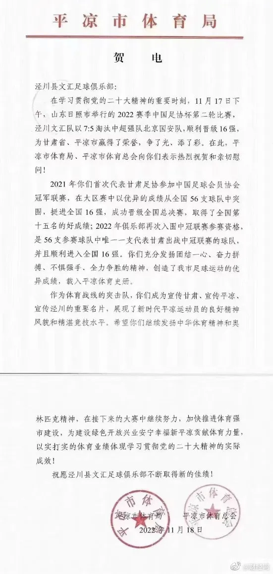 “欣闻泾川县文汇足球俱乐部于11月17日在2022年中国足协杯第二轮比赛中,通过点球大战以7:5爆冷淘汰劲敌北京国安。在此,向你们表示祝贺!”11月18日,甘肃省足协向泾川县足协、泾川县文汇足球俱乐部发去贺信,对泾川文汇队在足协杯中取得的良好成绩表示祝贺。甘肃省足协在贺信中写道,能够取得今日的成绩,是多年来泾川县足球协会、泾川县文汇足球俱乐部全体人员共同努力的结果,“希望你们以此为新的起点,在以后的比赛中奋勇争先,再接再厉。期待泾川县足球协会与全省各地县域足球协会一起,共同努力推动甘肃省足球事业迈上新台阶!”