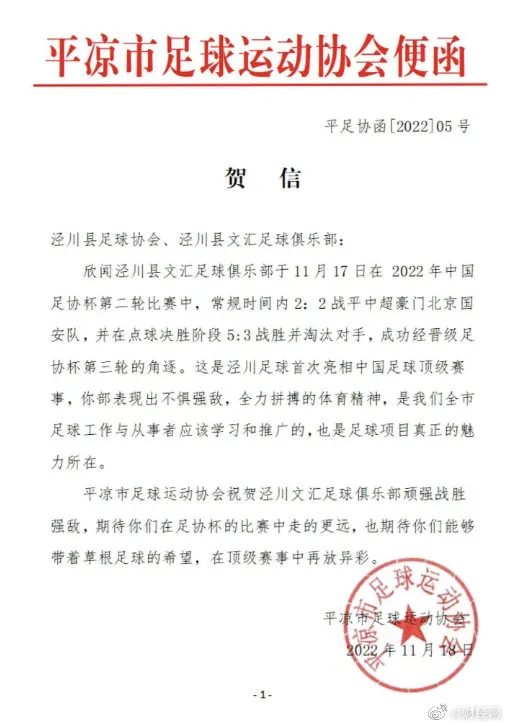 虎扑11月19日讯 足协杯第二轮泾川文汇淘汰北京国安后,甘肃省足协、平凉市体育局、平凉市运动总会、平凉市足协均向泾川文汇发去贺信。