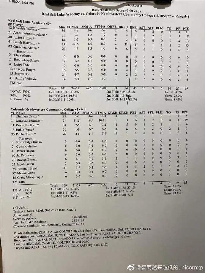 虎扑11月20日讯 博主“智商越来越低的unicornxp”更新微博说道,皇家盐湖城69-65击败科罗拉多西北社区大学,中国旅美小将偰李永炜发挥出色,关键时刻连续造成对手犯规,6罚全中帮助球队逆转取胜。