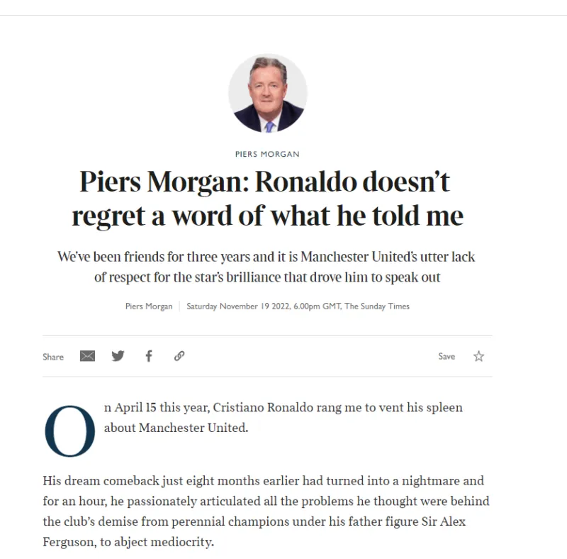 虎扑11月20日讯 刚刚完成全球独家专访的皮尔斯-摩根更新了自己的泰晤士报专栏,这一期的标题是—Piers Morgan: Ronaldo doesn’t regret a word of what he told me