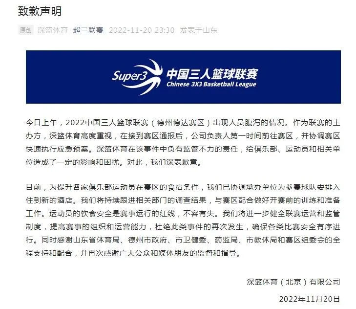 虎扑11月21日讯 2022中国三人篮球联赛(德州德达赛区)出现人员腹泻的情况,对此深篮体育发表道歉声明。