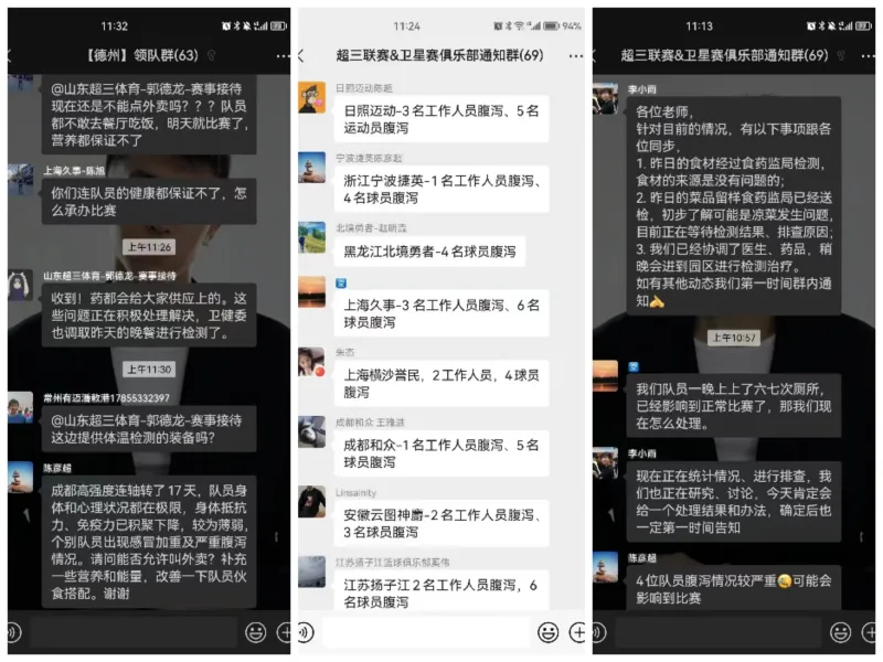 据知情人透露,多家正在参赛的俱乐部反映,疑似由于比赛承办方提供的餐食有质量问题,导致多家俱乐部的多名球员和工作人员出现腹泻情况,已经严重到影响球员的参赛。俱乐部在联赛工作群纷纷反映的食物质量很差,还不允许球员点外卖。