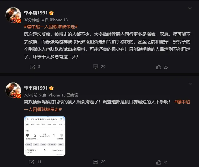 李康平今天稍早前曾在社媒发布消息:喜欢抽烟喝酒打假球的被人当众拷走了!调查组都是挑口碑最烂的人下手啊!