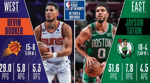 虎扑12月02日讯 今日联盟官方公布东西部月最佳球员,凯尔特人前锋杰森-塔特姆和太阳后卫德文-布克分别当选。