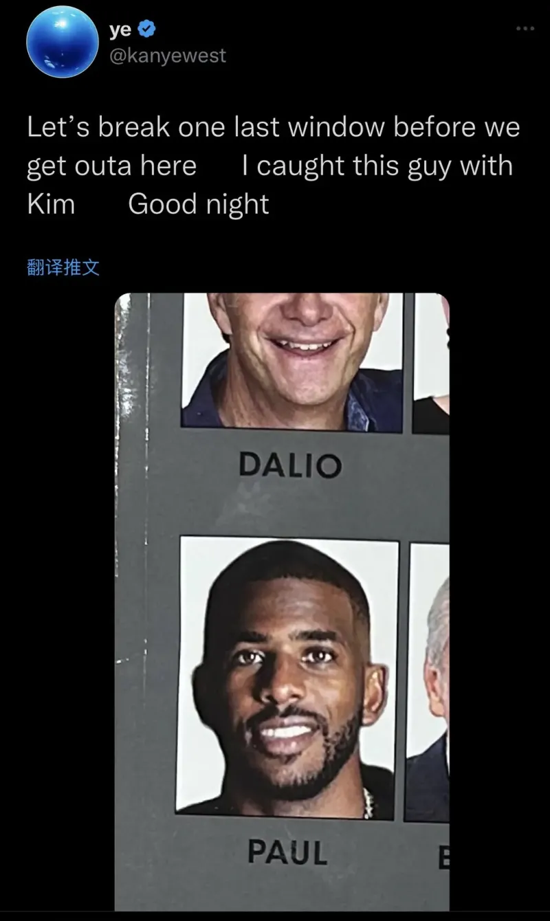 虎扑12月02日讯 知名说唱歌手坎耶-韦斯特发推,控诉太阳球员克里斯-保罗和他的前妻金-卡戴珊有不正当关系。