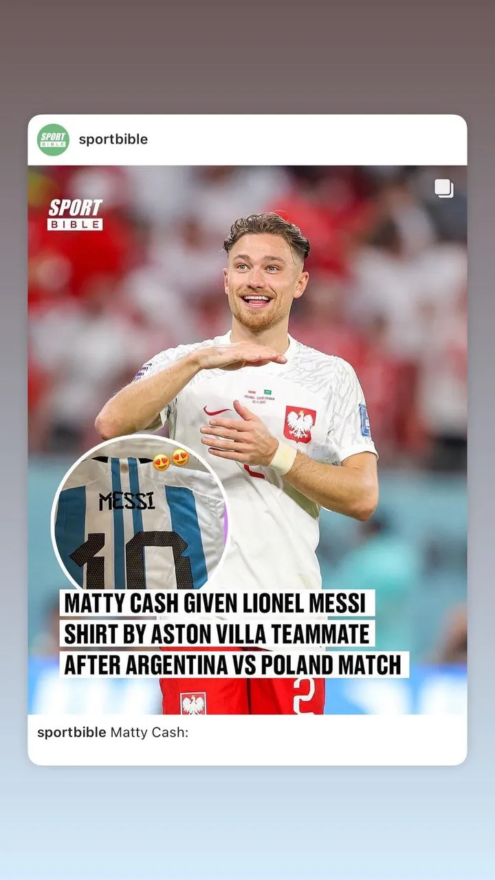 世界杯小组赛C组的最后一轮,波兰0-2输给阿根廷,但是凭借净胜球的优势晋级。卡什在赛后接受采访时透露,他的俱乐部队友——同是效力于阿斯顿维拉的阿根廷门将马丁内斯,赠送给了他一件梅西球衣。
