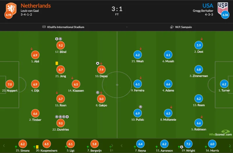 荷兰出场阵容:23-诺珀特,2-泰伯,4-范戴克,5-阿克(93'3-德里赫特),22-邓弗里斯,15-德隆(45'7-贝尔温)、14-克拉松(45'20-库普梅纳斯)、21-弗兰基-德容、17-布朗林德、8-雅克波(93'9-卢克-德容)、10-德佩(82'25-西蒙斯)
