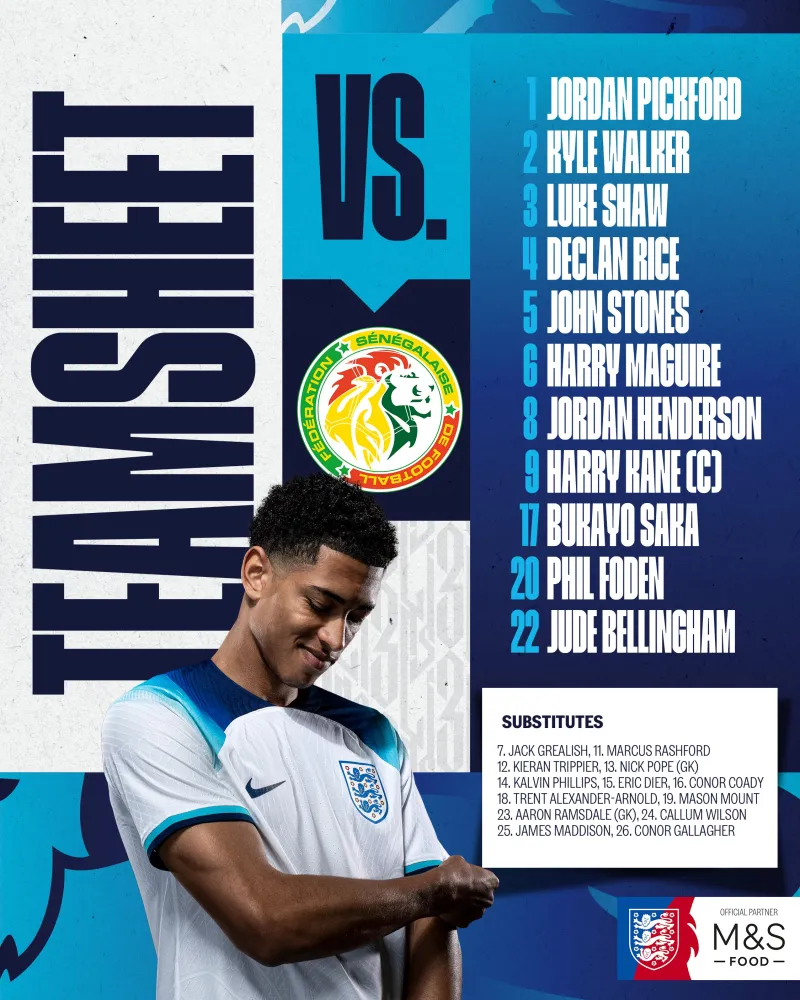 虎扑12月05日讯 北京时间12月5日03:00,世界杯1/8决赛,英格兰对阵塞内加尔,赛前双方公布了首发阵容。
