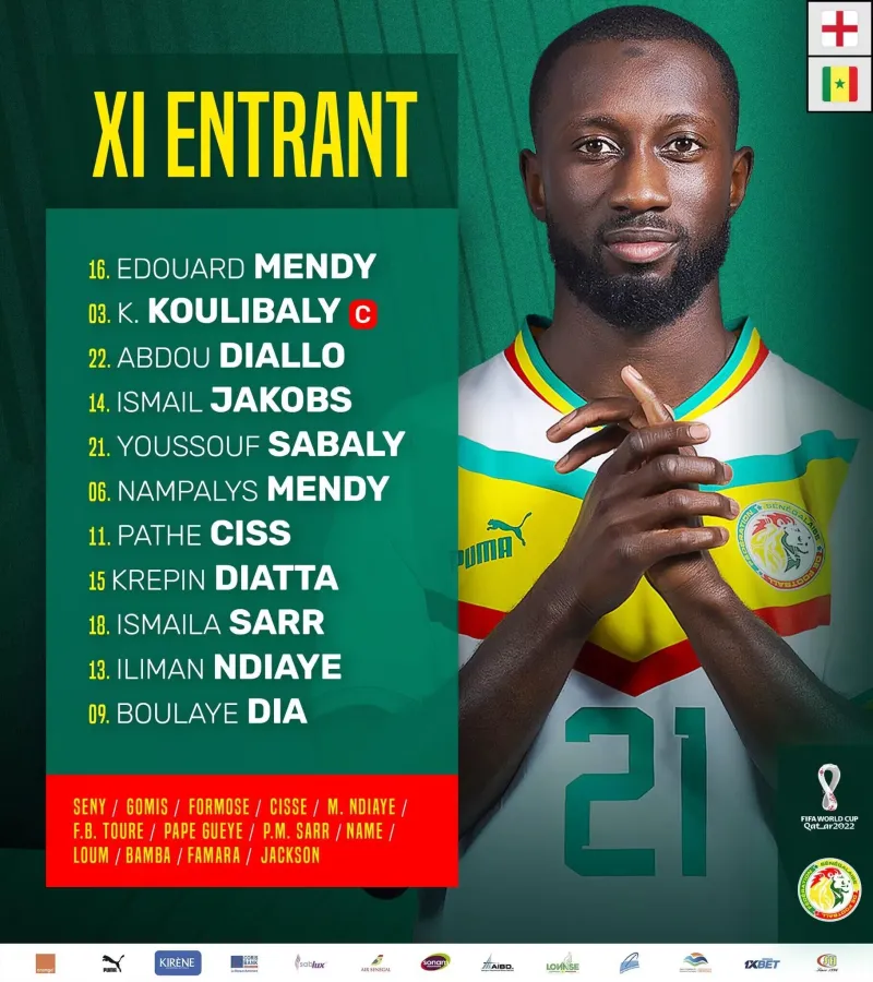 塞内加尔首发:16-爱德华-门迪、21-优素福-萨巴利、3-库利巴利、22-阿卜杜-迪亚洛、14-伊斯梅尔-雅各布斯、6-南帕里斯-门迪、11-帕特-西斯、15-克雷平-迪亚塔、18-伊斯梅拉-萨尔、13-伊利曼-恩迪亚耶、9-布莱耶-迪亚
