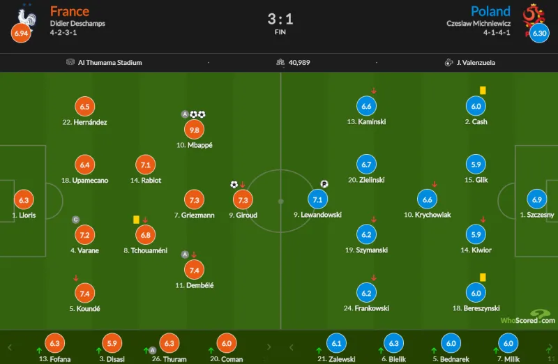 虎扑12月05日讯 虎扑12月04日讯 北京时间12月4日23:00,世界杯1/8决赛法国对阵波兰。上半场,姆巴佩助攻吉鲁破门打破僵局;下半场,登贝莱反击助攻,姆巴佩爆射破门完成传射,补时阶段小图拉姆助攻姆巴佩兜射破门锁定胜局,随后于帕梅卡诺送点、莱万重新主罚点球破门扳回一球。全场战罢,法国3-1战胜波兰晋级下一轮。QNj拜客生活常识网