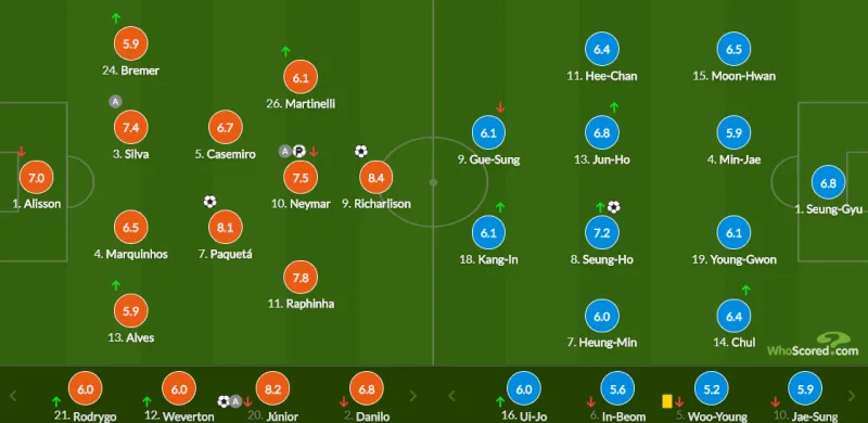 巴西首发:1-阿利森、2-达尼洛、3-蒂亚戈-席尔瓦、4-马尔基尼奥斯、14-米利唐、5-卡塞米罗、7-帕奎塔、10-内马尔、9-里沙利松、11-拉菲尼亚、20-维尼修斯