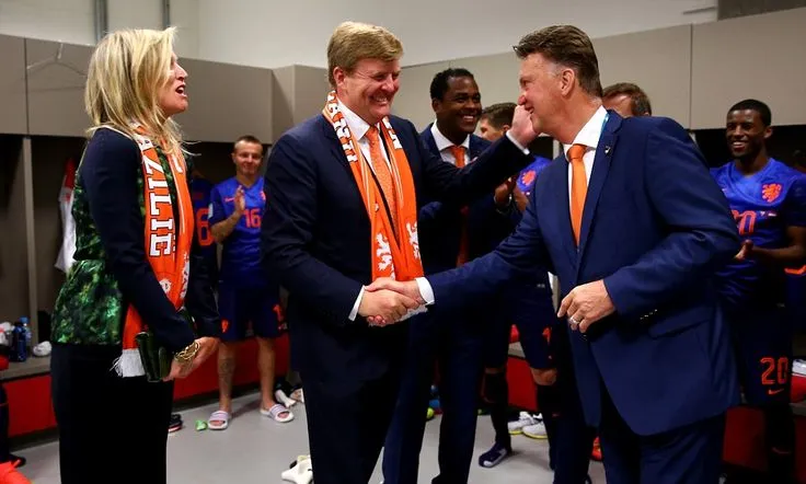 下图为2014年世界杯时,威廉国王和马克西玛王后在荷兰3-2战胜澳大利亚的比赛后造访球队更衣室。