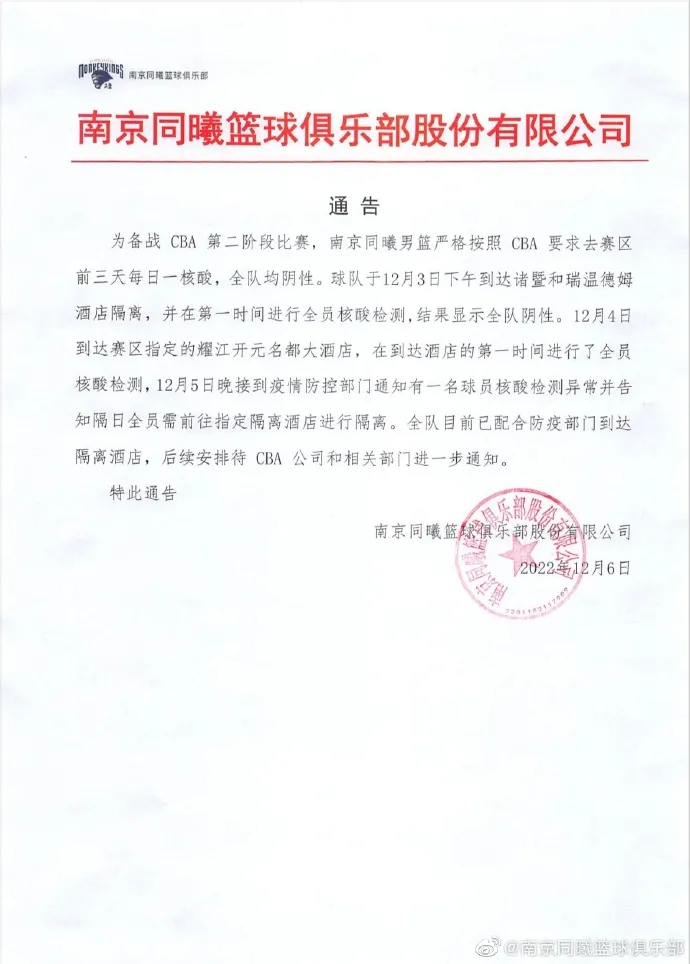 为备战CBA 第二阶段比赛,南京同曦男篮严格按照CBA要求去赛区前三天每日一核酸,全队均阴性。球队于12月3日下午到达诸暨和瑞温德姆酒店隔离,并在第一时间进行全员核酸检测,结果显示全队阴性。12月4日到达赛区指定的耀江开元名都大酒店,在到达酒店的第一时问进行了全员核酸检测,12月5日晚接到疫情防控部门通知有一名球员核酸检测异常并告知隔日全员需前往指定隔离酒店进行隔离。全队目前已配合防疫部门到达隔离酒店,后续安排待CBA公司和相关部门进一步通知。