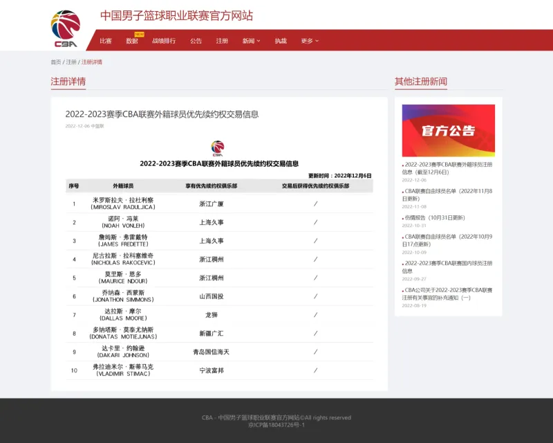 虎扑12月06日讯 据CBA联赛外籍球员优先续约权交易信息,辽宁队撤销对埃里克-莫兰德的优先续约权。
