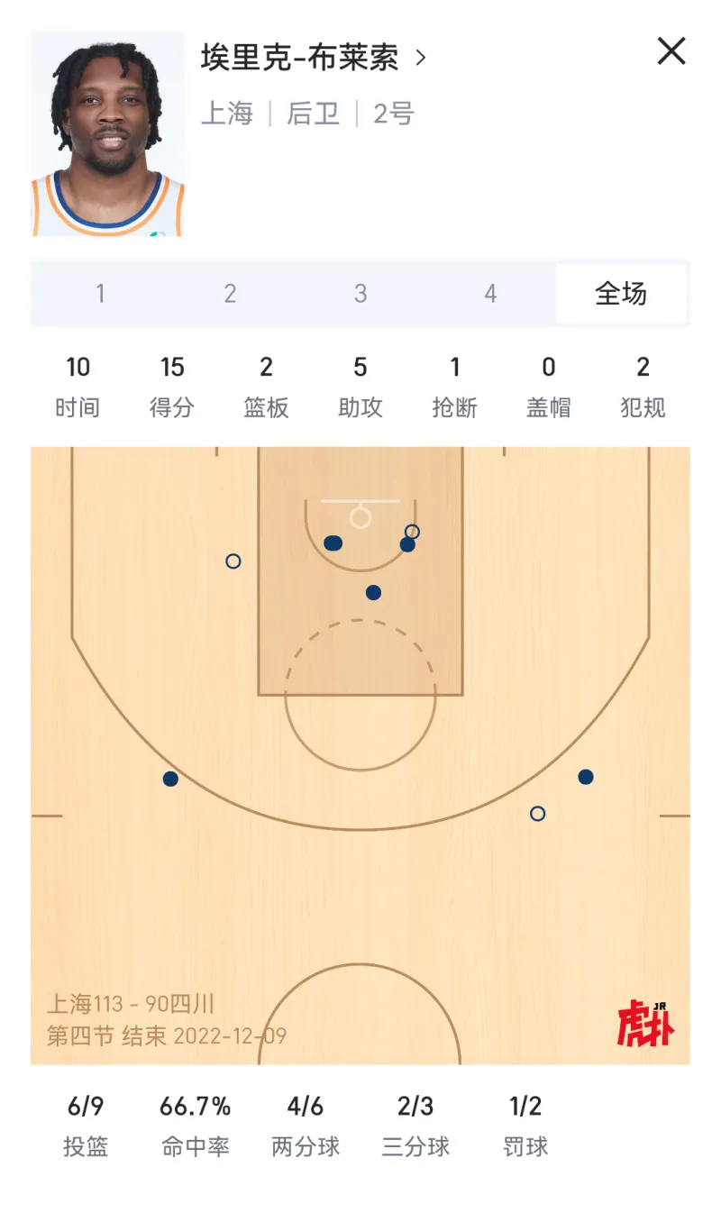 虎扑12月09日讯 2022-23赛季CBA常规赛第11轮,上海队113-90击败四川队,上海队外援布莱索迎来球队首秀,发挥出色拿到15分。
