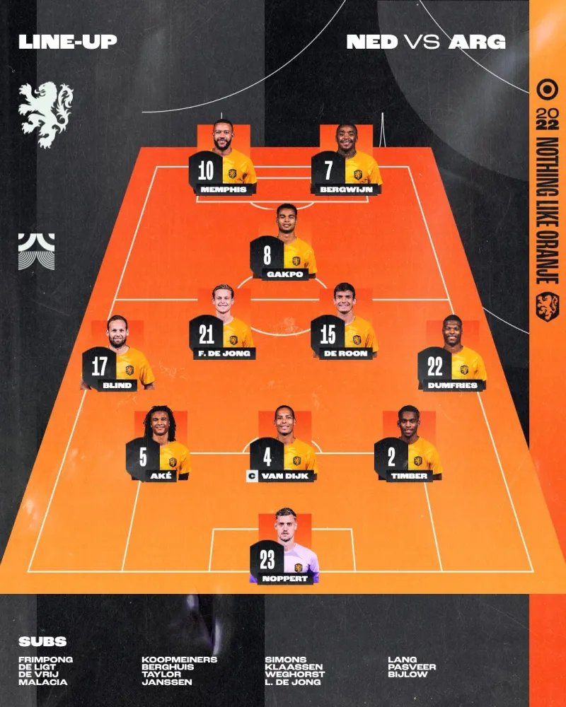 荷兰首发:23-诺珀特、2-廷贝尔、4-范戴克、5-阿克、17-布林德、22-邓弗里斯、8-加克波、15-德容恩、21-弗兰基-德容、7-贝尔温、10-孟菲斯-德佩