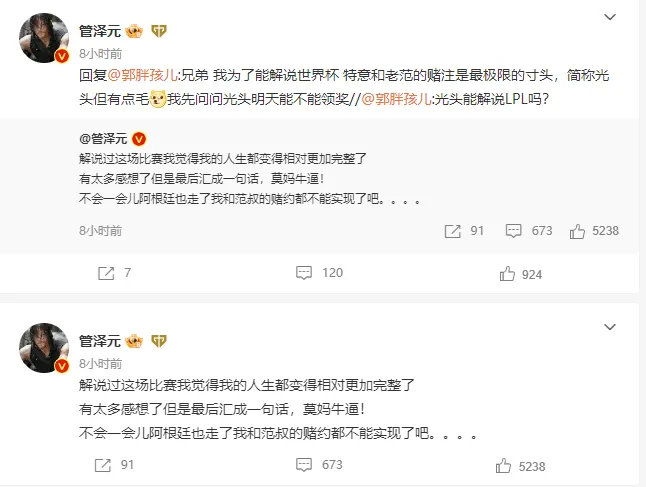“兄弟 我为了能解说世界杯 特意和老范的赌注是最极限的寸头,简称光头但有点毛我先问问光头明天能不能领奖”