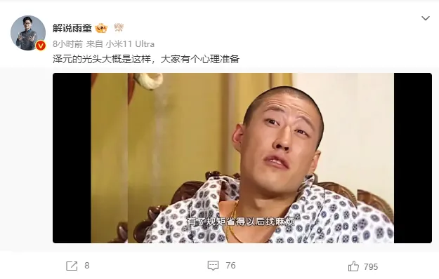 解说雨童也随后更推:泽元的光头大概是这样,大家有个心理准备
