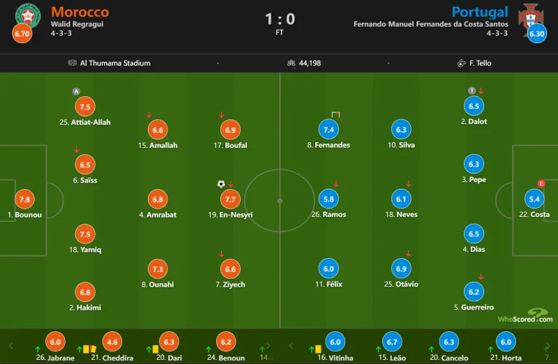 摩洛哥首发:1-布努、2-阿什拉夫、6-赛斯(57' 20-阿什拉夫-达里)、18-亚米克、25-阿提亚特-阿拉尔、8-奥纳西、4-阿姆拉巴特、15-塞利姆-阿马拉(64' 24-巴德尔-贝农)、7-齐耶赫(81' 14-阿布赫拉尔)、19-恩内斯里(64' 21-切迪拉)、17-布法尔(81' 26-贾卜拉内)