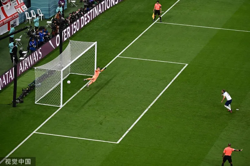 51’萨卡与贝林厄姆撞墙式配合后被琼阿梅尼绊倒造点,随后凯恩主罚点球大力打向球门左路,洛里扑错方向只能目送皮球入网!英格兰1-1法国!