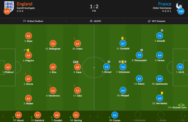 虎扑12月11日讯 北京时间12月11日03:00,世界杯1/4决赛,英格兰对阵法国。上半场,琼阿梅尼世界波破门首开记录;下半场,萨卡造点、凯恩主罚破门扳平比分,马奎尔头球攻门中框,芒特替补造点、凯恩再次主罚点球直接打飞错失扳平。全场战罢,法国2-1战胜英格兰晋级半决赛。
