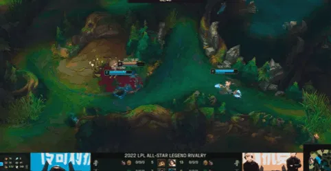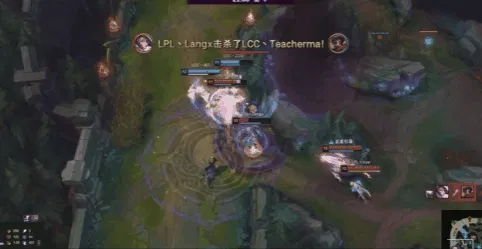 4分钟,双方中野2V2,LCC下路组合率先支援,将阿卡丽击杀。
