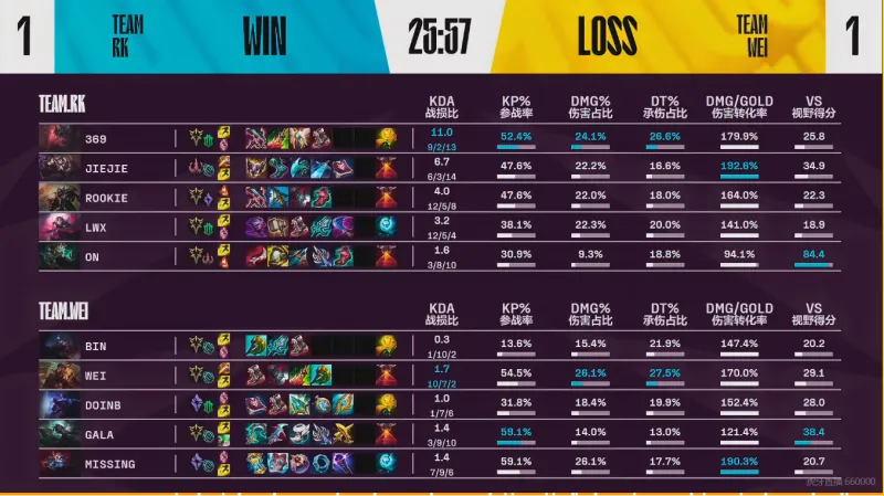 24分钟,大头率先阵亡,正面团战WEI溃败,RK完成一波1换5团战,一波终结比赛。