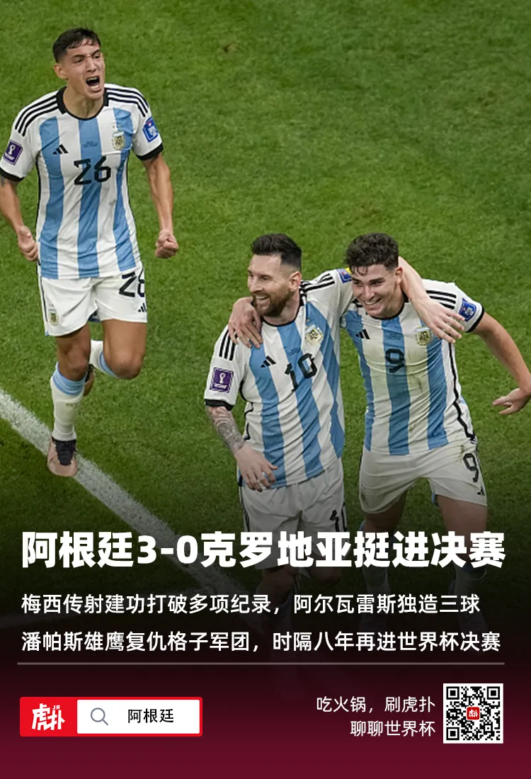 虎扑12月14日讯 北京时间3:00,世界杯半决赛阿根廷对阵克罗地亚。上半场,阿尔瓦雷斯造点梅西点射破门,随后阿尔瓦雷斯后场反击一条龙破门;下半场,梅西助攻阿尔瓦雷斯梅开二度,最终阿根廷3-0克罗地亚晋级世界杯决赛,阿根廷决赛将面对法国与摩洛哥之间胜者。