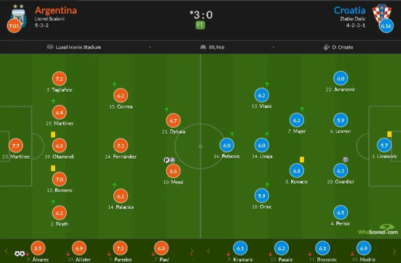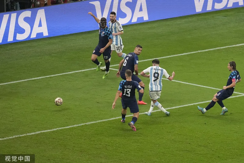 69’梅西右侧底线抹过格瓦迪奥尔后低平传中,阿尔瓦雷斯轻松推射破门完成梅开二度!阿根廷3-0克罗地亚。