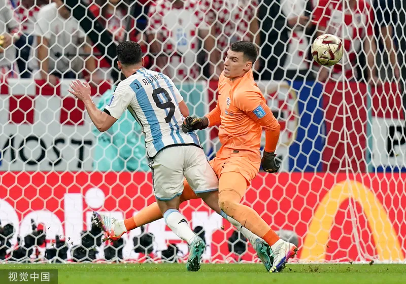 35’阿尔瓦雷斯禁区挑射造成利瓦科维奇禁区犯规,裁判判罚黄点套餐,梅西点射破门!阿根廷1-0克罗地亚;
