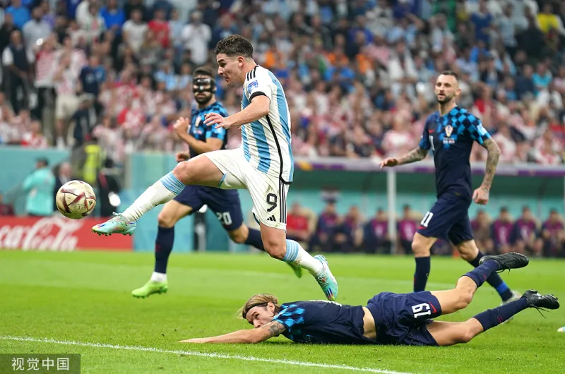 39’阿尔瓦雷斯后场带球反击至禁区,随后直接抽射破门!阿根廷2-0克罗地亚;