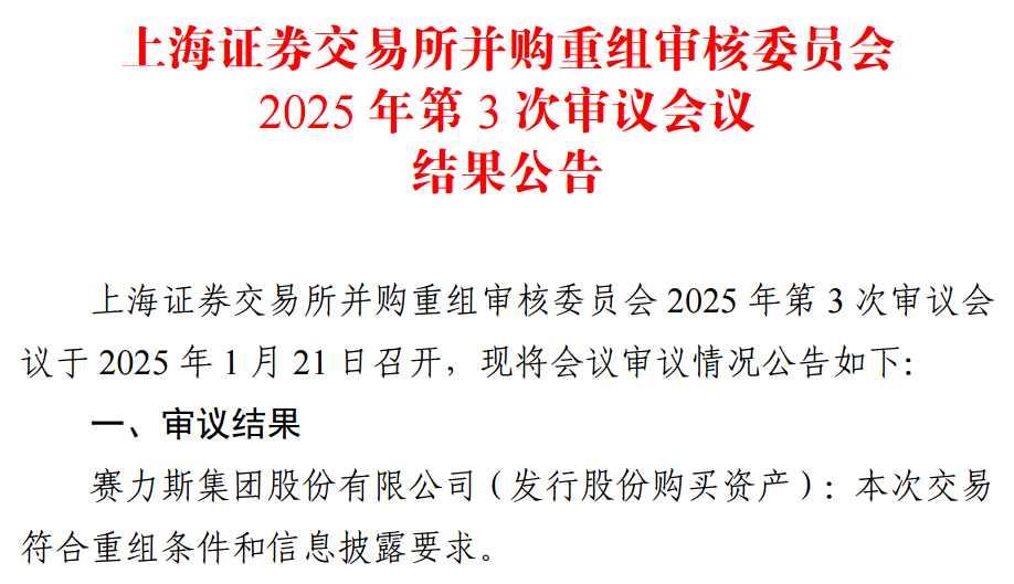 【导读】赛力斯重大资产重组事项 获上交所重组委审议通过 中国基金报记者 邱德坤 1月21日晚间,赛力斯公告称,上海证券交易所并购重组审核委员会于当日召开会议,审议并通过了公司发行股份购买资产事项。
