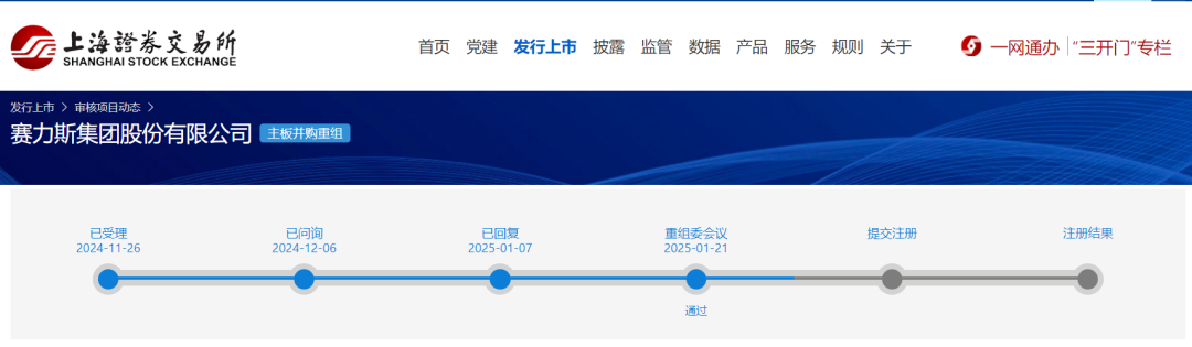 赛力斯重大资产重组 从受理到通过历时近两个月 公告显示,上述交易获得上海证券交易所受理,是在2024年11月26日收到上海证券交易所出具的《关于受理赛力斯集团股份有限公司发行股份购买资产申请的通知》。 上海证券交易所依据相关规定,对赛力斯的申请文件进行核对,认为申请文件齐备符合法定形式,决定予以受理并依法进行审核。 如今间隔不到2个月,上述交易获上海证券交易所并购重组审核委员会审议通过。