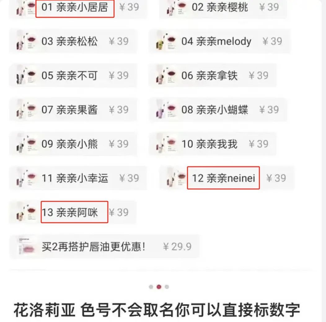 还有网友扒出,过去花洛莉亚就在产品命名上大打“擦边球”,“亲亲小居居”、“亲亲neinei”、“亲亲阿咪”等等。
