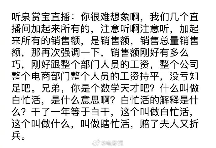 近日,听泉赏宝在直播间跟网友唠起了嗑,还自爆了一个让人意想不到的“猛料”。听泉提到,“你很难想象啊,我们几个直播间加起来所有的,注意听,加起来所有的销售额,销售额刚好有多么巧,刚好跟整个部门人员的工资,整个公司整个电商部门整个人员的工资持平。”xER拜客生活常识网
