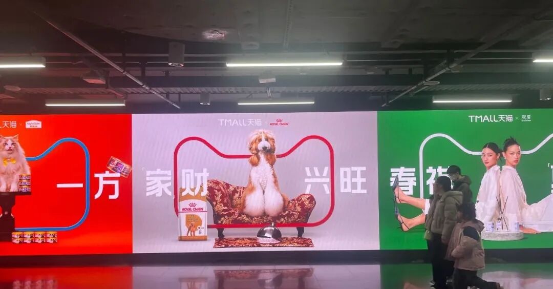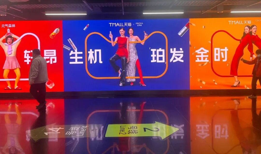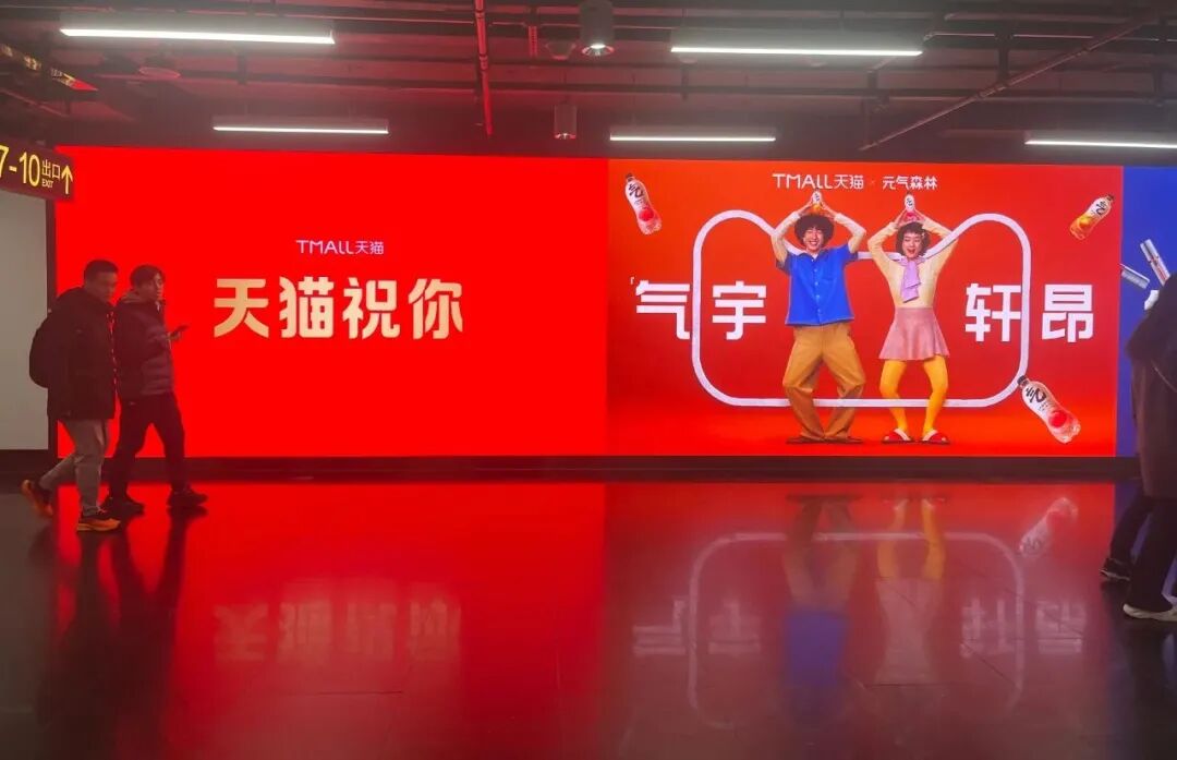在线下,这些品牌吉祥话海报还把“接龙”创意,在现实空间具象化,在杭州、上海、北京、深圳城市中心地铁站点,打造出“超长长长好运祝福”打卡点——好运一条「接」。