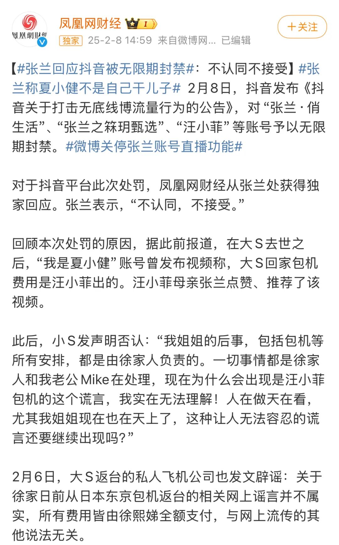 事情到这里没有完,网友经过深扒发现,这个“夏小健”身份似乎并不简单。据九派新闻消息,“夏小健”和张兰汪小菲母子互动频繁,多次出现在张兰的直播间,还多次和汪小菲连麦喊“菲哥”。2月6日,小S通过经纪人回应称:“我姐姐的后事,包括包机等所有安排,都是由徐家人负责的。一切事情都是徐家人和我老公Mike在处理。现在为什么会出现是汪小菲包机的这个谎,我实在无法理解!人在做天在看,尤其我姐姐现在也在天上了,这种让人无法容忍的谎言还要继续出现吗?”不久,私人飞机公司Jetbay也发声辟谣:关于徐家日前从日本东京包机返台的相关网上谣言并不属实,所有费用皆由徐熙娣全额支付,与网上流传的其他说法无关,感谢各界的关注与理解。到现在,确定“汪小菲包机”的消息是假的。抖音也第一时间进行处理,目前,造谣“汪小菲为大S骨灰包机”的网友“夏小健”账号已全部清空并被禁止关注。2月6日,张兰在停播三天后复播,直播间人气再度十万加,不过,这场直播一个多小时后就被突然封禁了,具体原因尚不明确。蝉妈妈数据显示,2月6日当天,张兰直播间创下100万-250万元的销售额,人气峰值达41.1万,观看人次达930.6万。随着舆论进一步发酵,其他平台也跟上抖音的脚步,目前,张兰微博账号的直播功能已经暂停。2月8日下午,微博管理员发布消息称,截至目前,站方巡查发现“汪小菲包机接大S骨灰”“大S遗嘱曝光”等多类从站外流转至微博的典型谣言,依据《微博社区公约》等相关规定,站方共清理相关谣言内容2100余条。“同时,暂未排查到@张兰俏江南创始人近期在微博站内恶意炒作营销并获取商业利益的违规行为,经综合研判,已暂停@张兰俏江南创始人的直播功能。”“微博关停张兰账号直播功能”的话题也冲上了热搜第一。 ILG拜客生活常识网